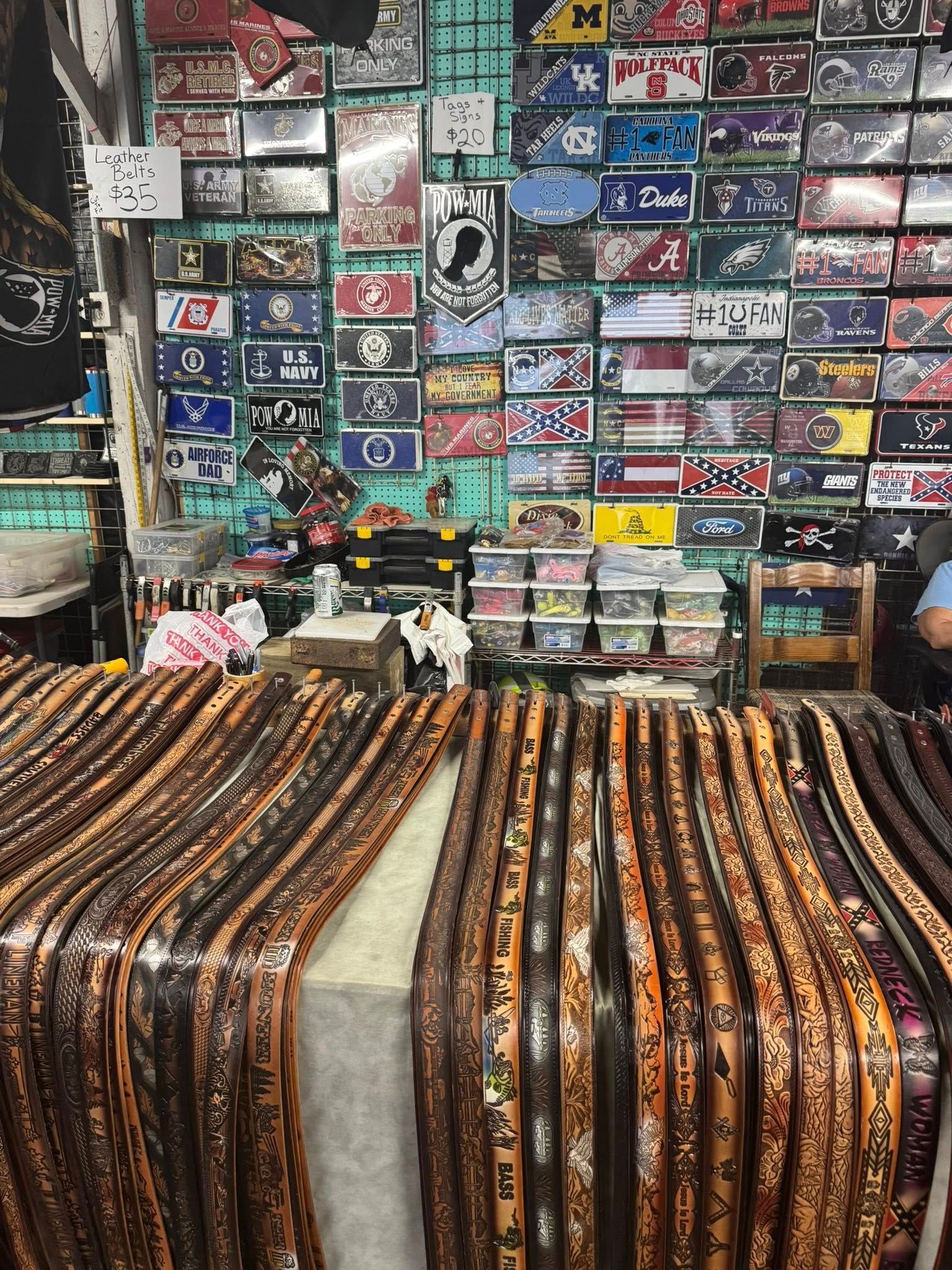 Deb offers custom license plates, president memorabilia, hats, flags and so much more, oh and don't forget the custom leather belts it’s a one stop shop. Located in front of the concession stand.